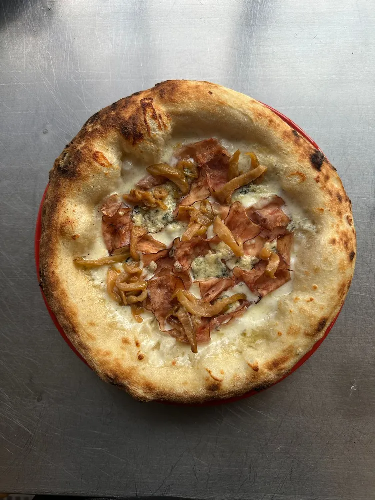 Queso mozzarella, tocino ahumado, pera caramelizada, queso azul.