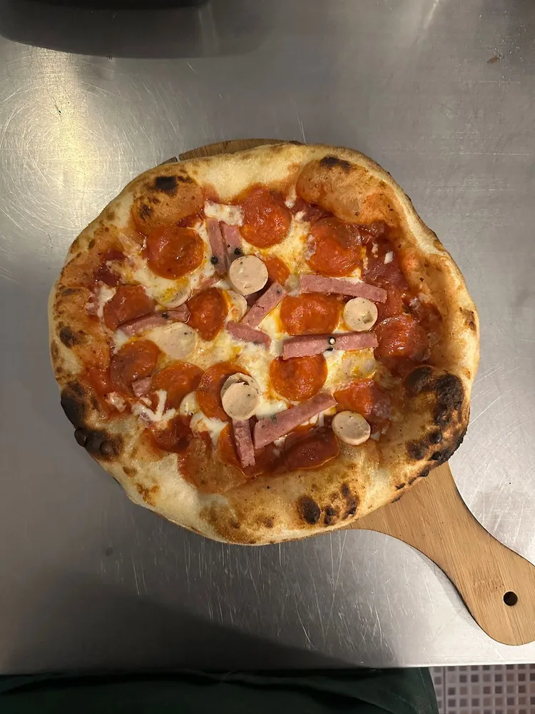 Salsa pomodoro, mozzarella, peperoni, salami, salchicha italiana.