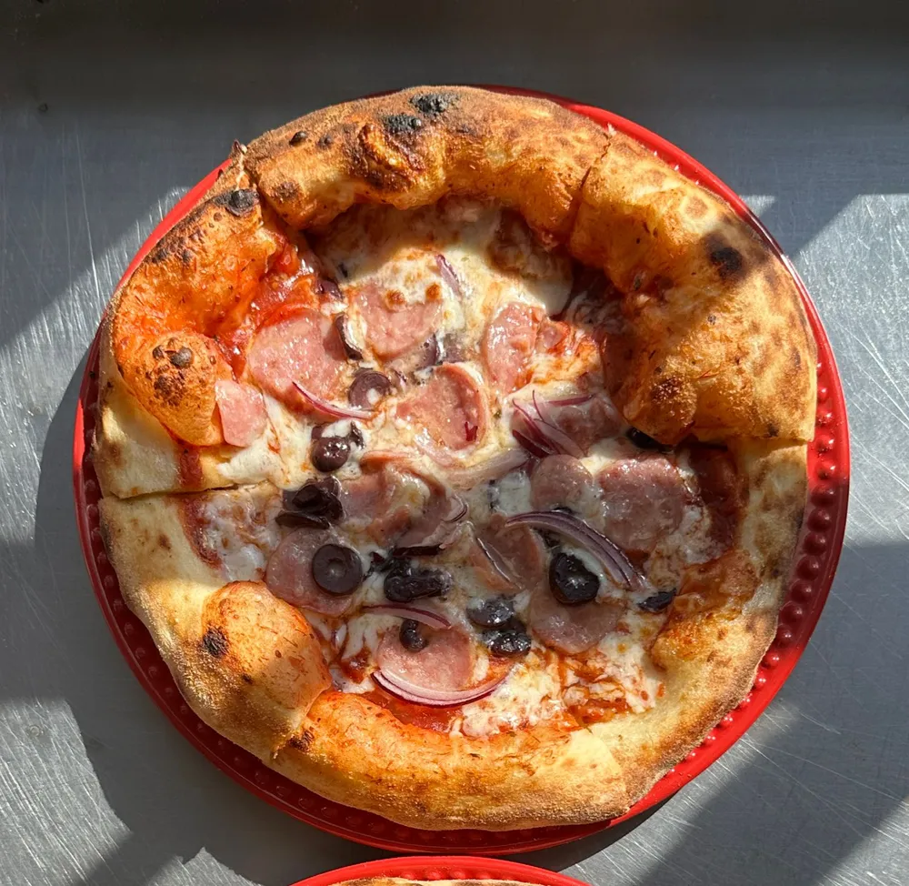 Salsa pomodoro, mozzarella, chorizo argentino, aceituna negra, cebolla morada.