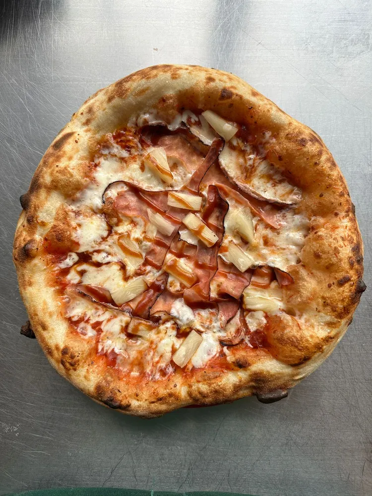 Salsa pomodoro, mozarella, tocino ahumado, piña, salsa BBQ