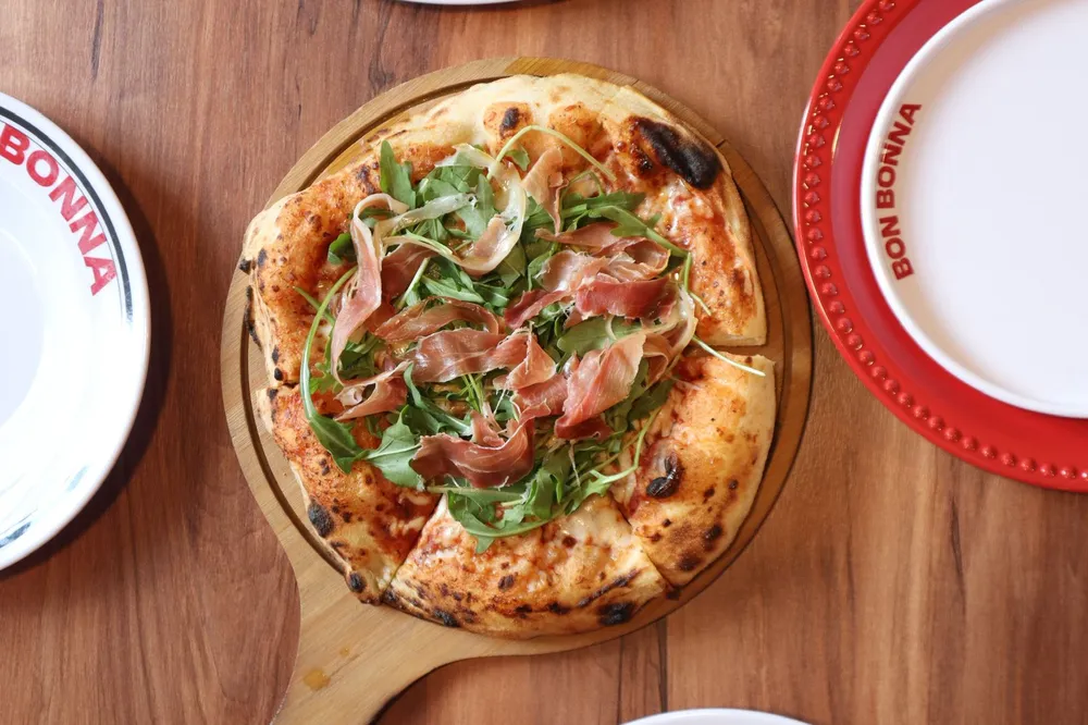 Salsa pomodoro, mozzarella, prosciutto, pera, arúgula.