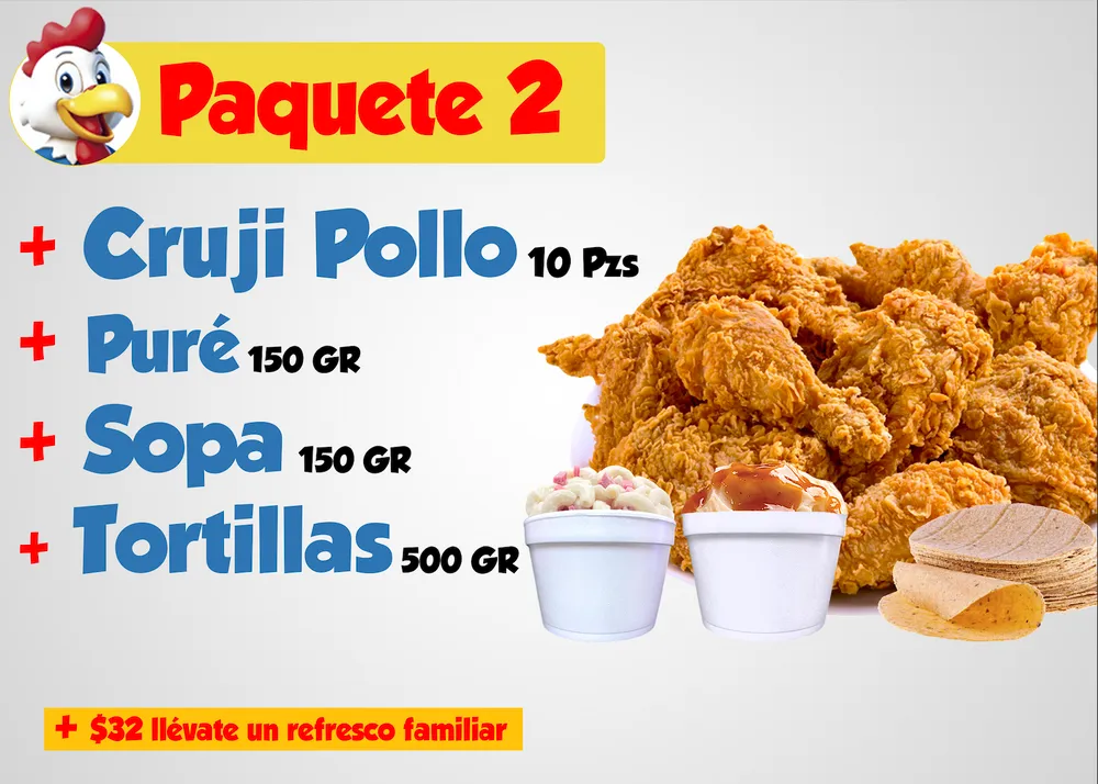 10pzs Cruji Pollo + 1 Puré 150gr + 1 Sopa 150gr + Tortillas 500gr.