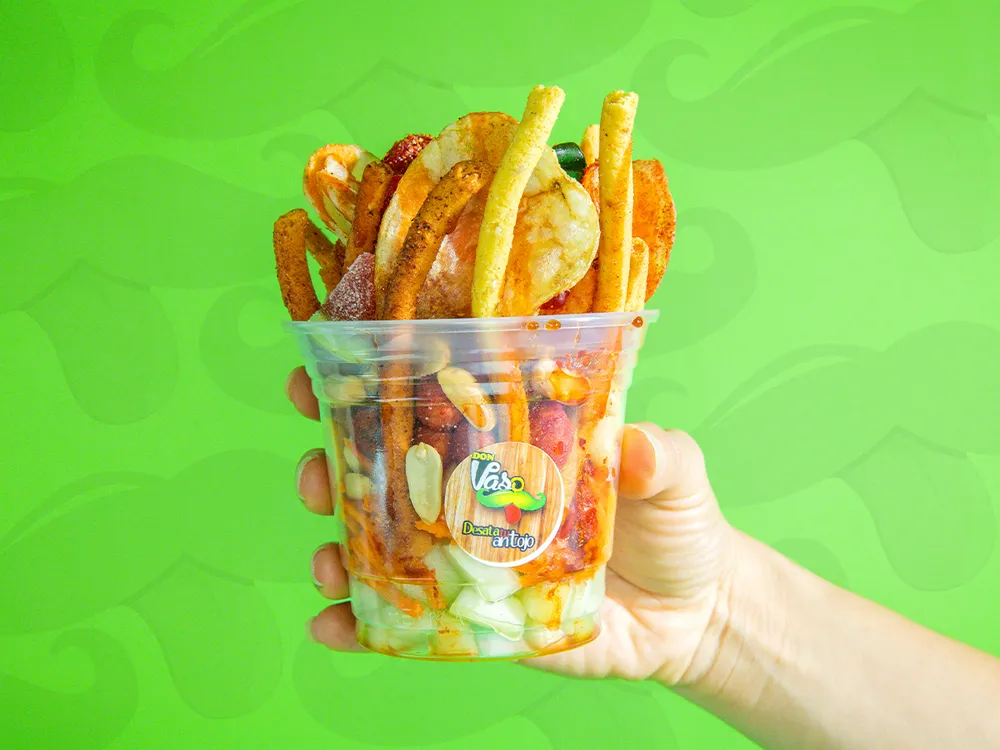 Don Vaso botanero con un mix de verduras frescas con jicama, pepino y zanahoria con un toque crujiente de cacahuates y frituras. Acompañado de gomitas dulces, enchiladas y el aderezo perfecto para hacer de cada mordida una experiencia única.