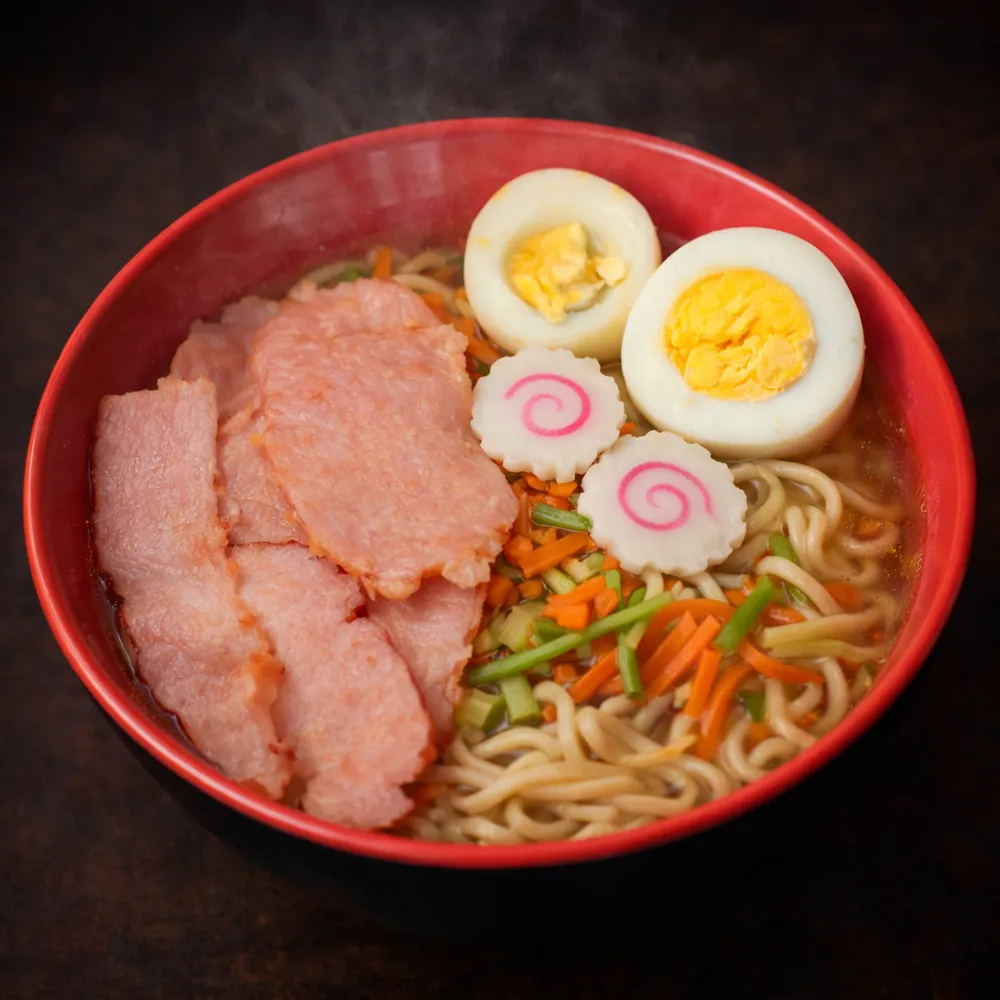 Pasta tipo fideo con tocino, un mix de verduras, huevo hervido y caldo a base de miso.