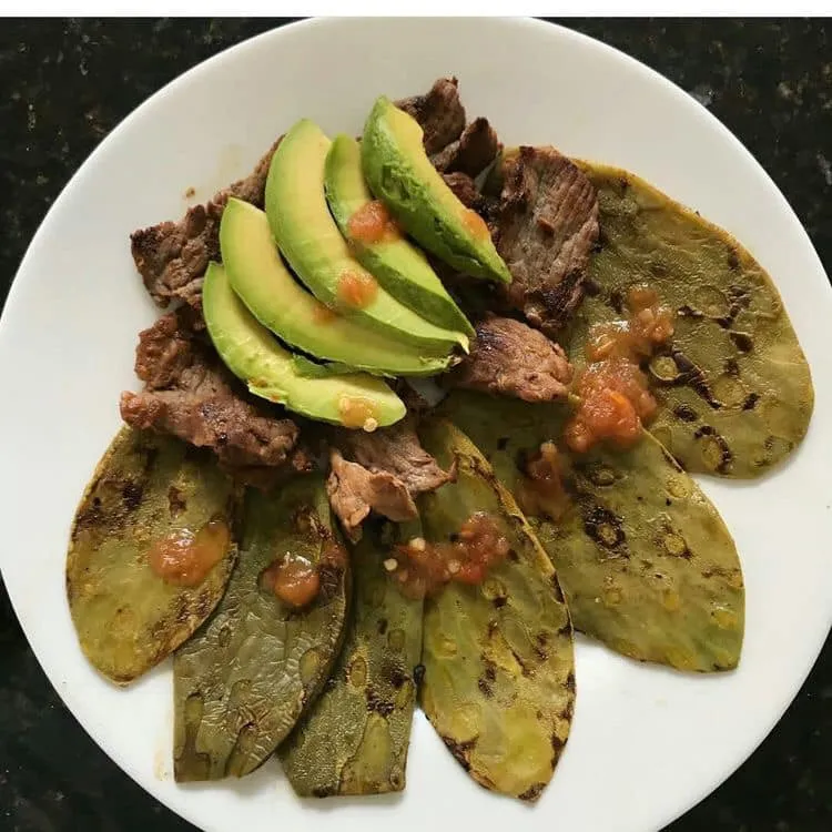 Bistec de res con nopales asados, arroz y guacamole.