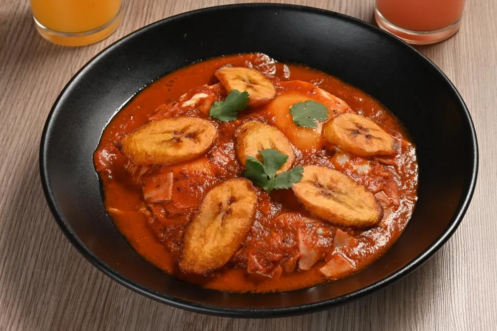 Estrellados sobre dos tortillas fritas con jamón bañados en salsa roja, servidos con platanos fritos.